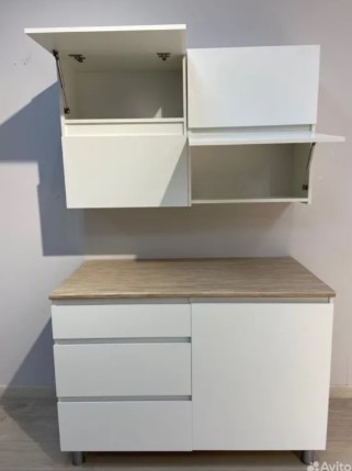 Готовая кухня в белом декоре в комплекте со столешницей. Кухонный гарнитур не имеет ручек, их роль выполняют скосы под 45 градусов на нижних модулях и выступы на фасадах навесных шкафов. Это позволяет сэкономить пространство, а также придаёт кухне более целостный вид.